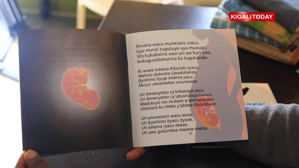 Ibyo bitabo byitwa ‘Ikaze mwana wacu’ hakaba icyagenewe umwana w’umukobwa ndetse n’umwana w’umuhungu. Haba harimo inkuru isomerwa umwana uri mu nda ya nyina, igira iti “Uraho mwana wacu, uyu munsi twasubiye kwa muganga muri gahunda y’isuzuma ry’igihembwe muri gahunda yo gusuzuma abagore batwite ngo barebe uko abana bameze mu nda, icyadushimishije ni uko baduhaye agafoto kawe tukaba tukuvugisha tukureba. Kukubona aho witurije aho mu nda ni nko kubona ururabo rwa Roza mu gihe cyarwo cyo kubumbura. Reka tuvugire rimwe, turagukunda”.