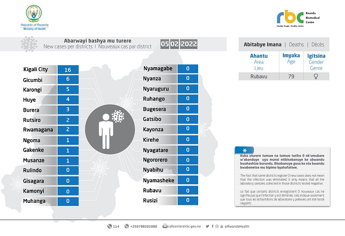 Minisiteri y’Ubuzima (MINISANTE) yatangaje ko ku wa Gatandatu tariki 05 Gashyantare 2022 mu Rwanda habonetse abanduye Covid-19 bashya 41, bakaba babonetse mu bipimo 15,270.