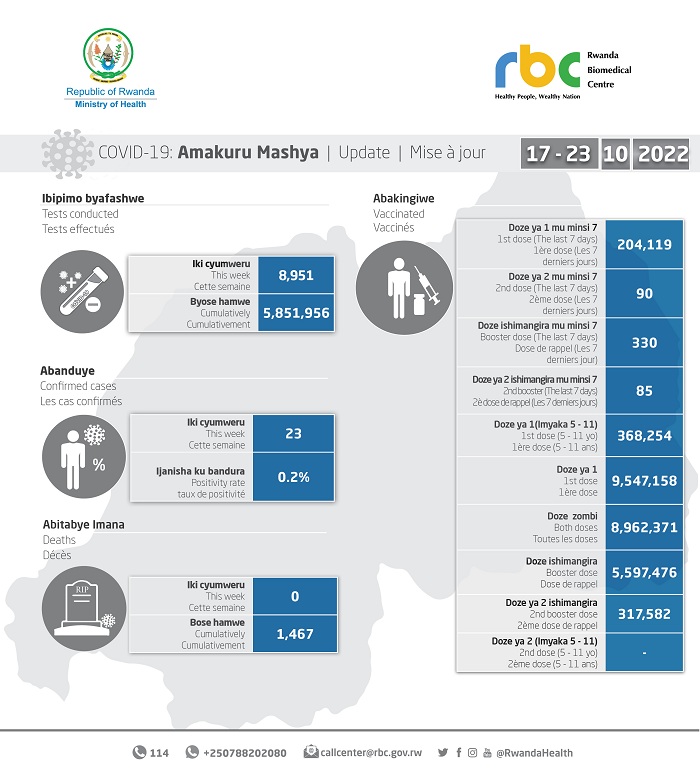 Minisiteri y’Ubuzima (MINISANTE) iragaragaza ko mu cyumweru cyo kuva tariki 17-23 Ukwakira 2022 mu Rwanda habonetse abantu 23 banduye Covid-19, bakaba babonetse mu bipimo 8,951 byafashwe hirya no hino mu gihugu. Abanduye 22 ni ab’i Kigali nahi umwe ni uw’i Rubavu. Nta muntu witabye Imana mu Rwanda muri icyo cyumweru azize (…)