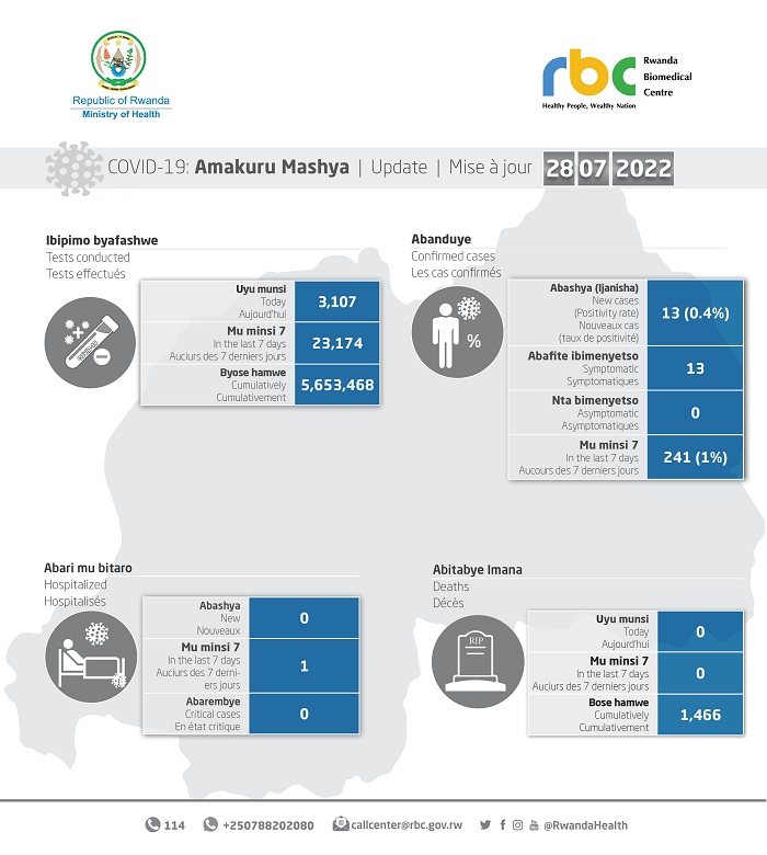 Minisiteri y’Ubuzima (MINISANTE) yatangaje ko ku wa Kane tariki 28 Nyakanga 2022 mu Rwanda habonetse abanduye Covid-19 bashya 13, bakaba babonetse mu bipimo 3,107. Abantu 5 banduye babonetse i Kigali, 4 i Ngororero, 3 i Karongi n’umwe i Muhanga. Nta muntu witabye Imana, imibare igaragaza ko abamaze kwitaba Imana mu Rwanda (…)